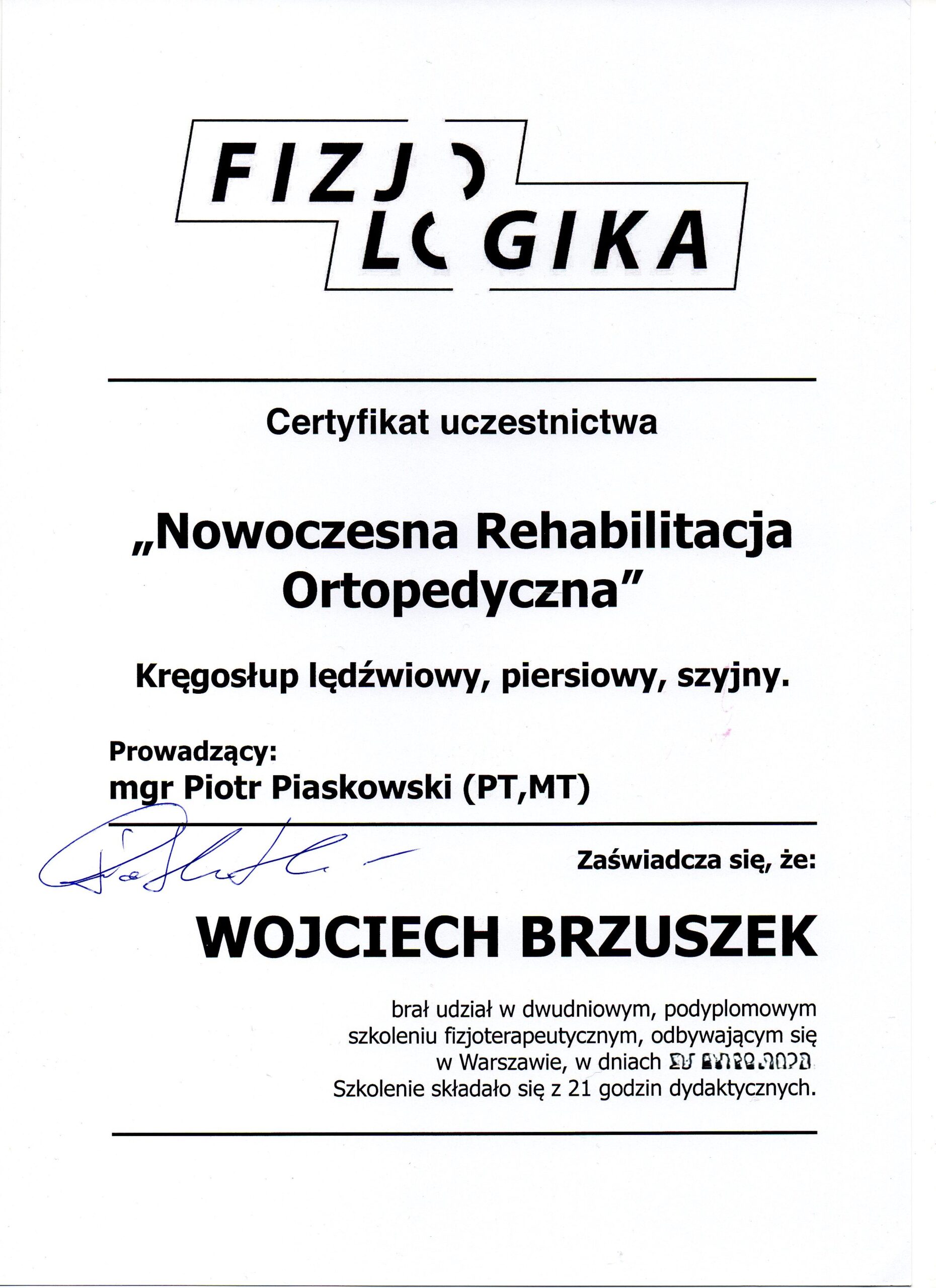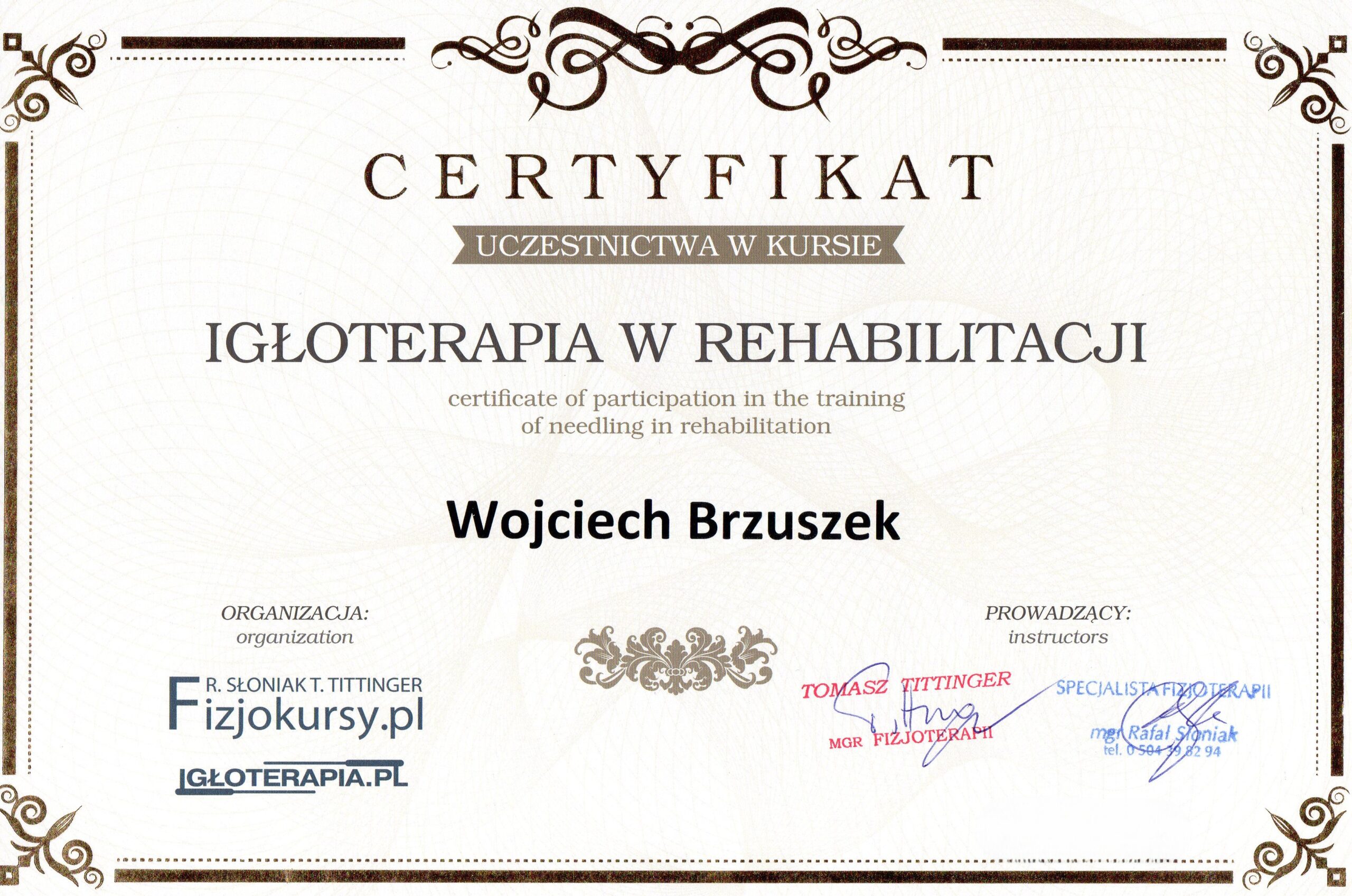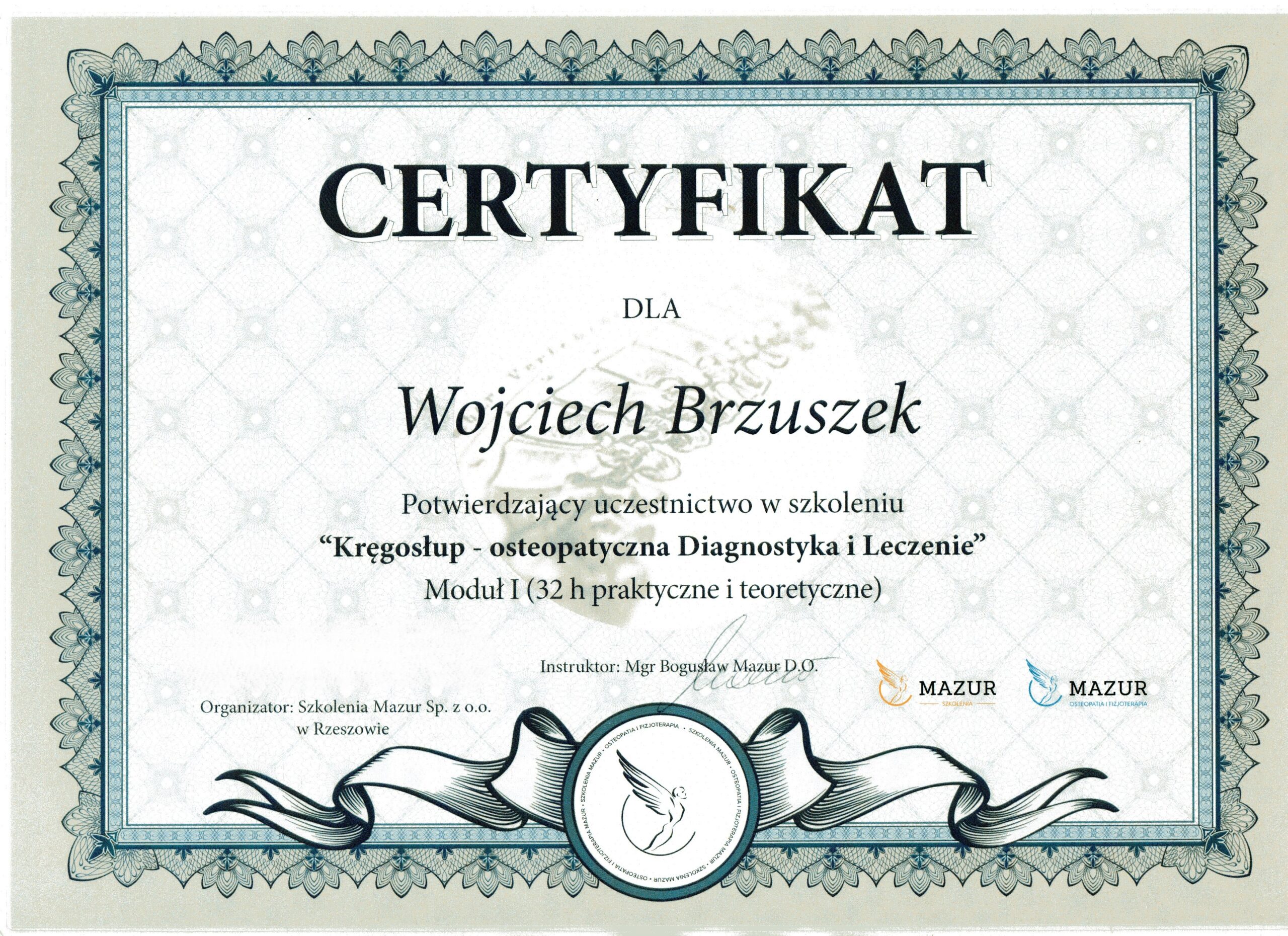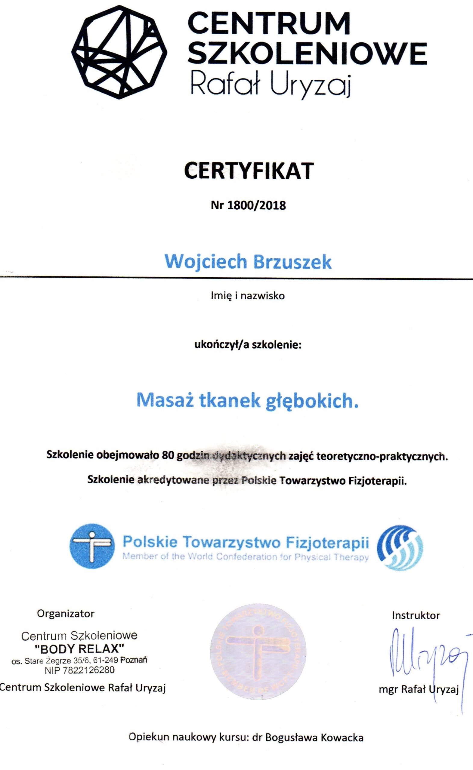 Ukończyłem liczne kursy z zakresu terapii manualnej, igłoterapii, masażu tkanek głębokich, terapii punktów spustowych oraz szkolenia obejmujące programowanie treningu wraz z fizjoterapią funkcjonalną.